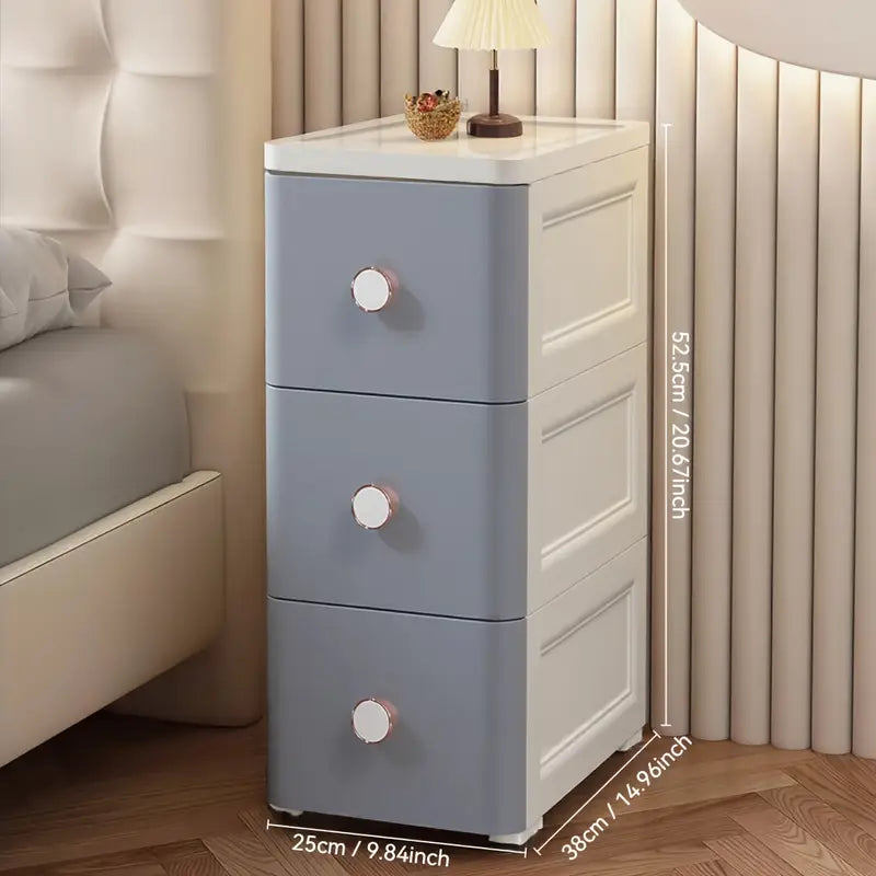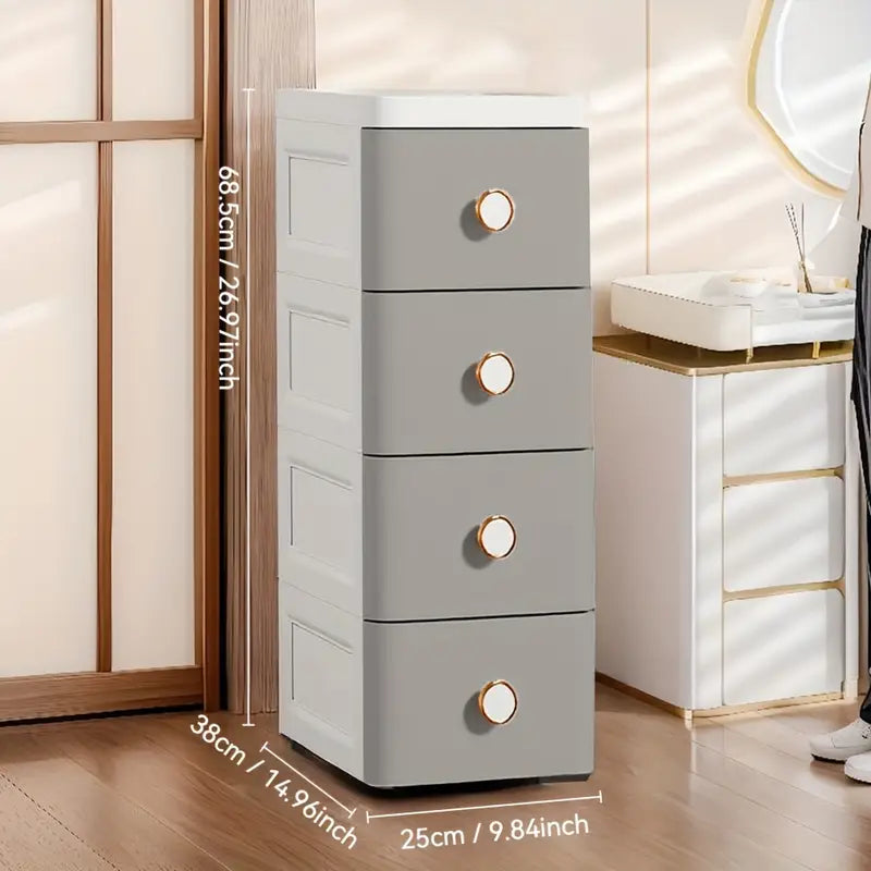 Für platzsparende Aufbewahrung:Schlanker, rollbarer Schrank für enge Räume.